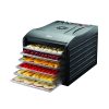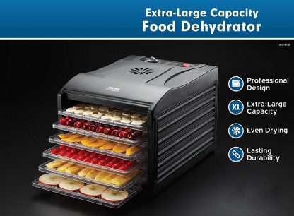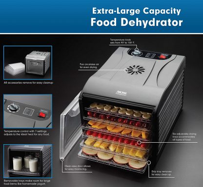 On six spacious, height adjustable trays. The automatic fan promotes even drying and prevents the overheating that eliminates food’s vital nutrients while the adjustable thermostat ensures that all foods are dehydrated at their optimal temperature.