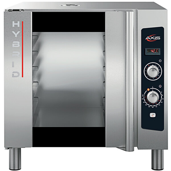 The Axis by MVP AX-HYBRID offers unprecedented versatility in a convection oven, allowing you to roast, fry, reheat, and cook all kinds of food in a variety of different ways. With advanced features such as steam injection your meals will retain moisture, letting you create mouthwatering dishes that customers will love. The Axis by MVP AX-HYBRID holds 5 full size sheet pans giving you the capacity of many full size units all in one space saving countertop design.