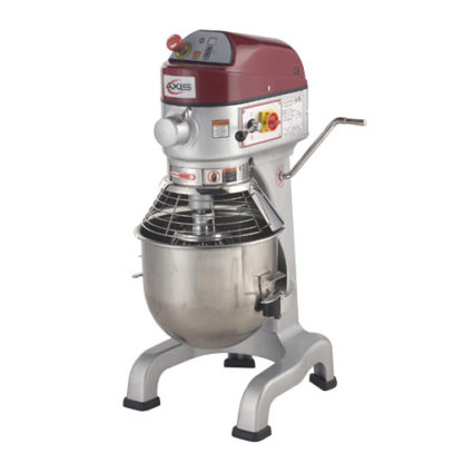 These commercial planetary mixers operate silently and come standard with a stainless steel bowl and bowl guard, an aluminum flat beater, stainless steel wire whip and an aluminum dough hook. There are side mounted controls on the planetary mixer that include a digital timer (0-30 minutes) and a separate start and emergency stop button. Axis commercial planetary mixers incorporate a reliable gear driven design with a 3 speed motor and they have heat-treated hardened alloy steel gears and shafts.