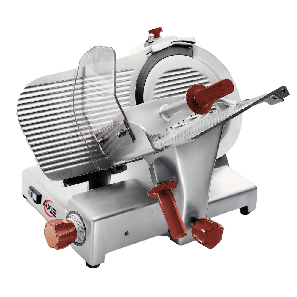 Axis Food Slicer, manual, gravity feed, 14″ diameter blade, 0 to 1″ thickness adjustment knob, top mounted sharpener, slice deflector & knife cover, gear driven, aluminum, rubber feet, 0.50 HP, cord, cULus, ETL-Sanitation