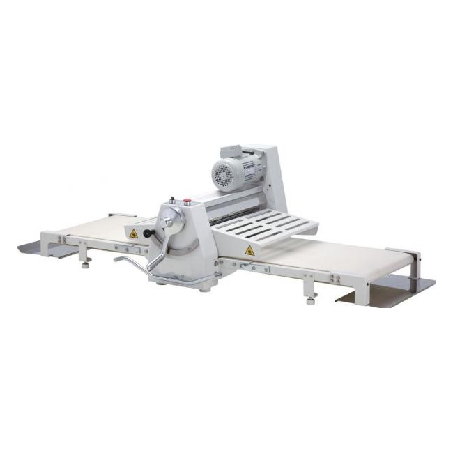 The thickness can be adjusted on this dough sheeter between 3-50mm and it operates with a simple, single push button. There are safety guards on both sides of the roller of the dough sheeter and both sides of the conveyor table fold up in seconds to conserve counter space. There is an aluminum alloy head housing on this dough sheeter and it has a roller speed approximately 540mm per second.