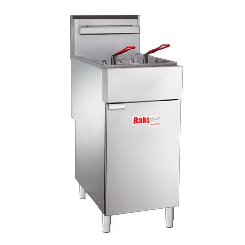 Fryer, natural gas or liquid propane, floor model, 15-1/2″ W, 50 lb. fat capacity, 200°F to 400°F temperature range, double layer access door, twin baskets, nickel plated basket rack, drain rod, (4) heat exchange tubes with baffles, stainless steel construction, galvanized steel side panels, 3/4″ NPT inlet, 1-1/2″ drain valve, millivolt system (no electrical hookup required), 120,000 BTU, cETLus, ETL-Sanitation