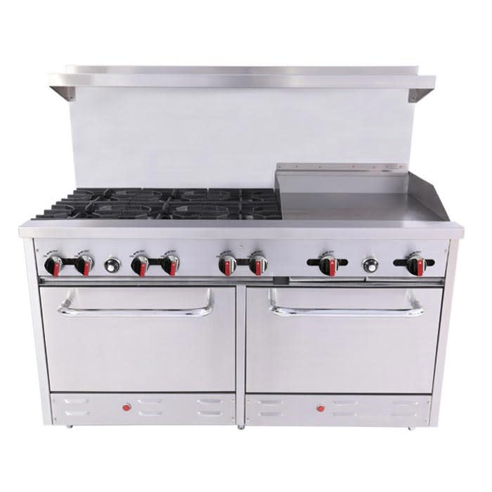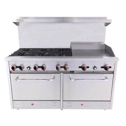 Restaurant Series Range, Natural gas, 60″, (6) 30,000 BTU open cast iron burners, 12″ x 12″ removable cast iron grates, (1) 24″ W 3/4″ thick griddle with (2) burners, (2) standard ovens, (2) chrome oven rack, 6″ plate rail, 2-piece back guard & shelf, stainless steel front & sides, 6″ stainless steel legs with adjustable feet, 282,000 BTU, cULus, UL EPH Classified (LP conversion kit included)