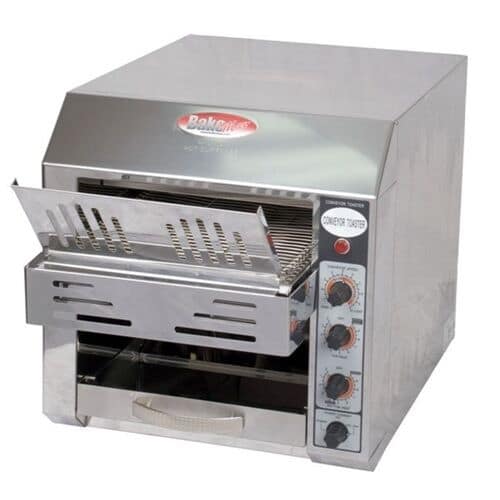 In an hour, the Bakemax BMCT300 horizontal conveyor toaster can produce 360 slices of toasted bread. The conveyor belt extends outward, so users can conveniently place bread slices on it, and because of its 9.8-inch width, this belt accommodates two slices side by side. Slices go in the loading area at the top, move through the toasting chamber, and dispense at the bottom. Around the loading area, the exterior stays cool to the touch, while a burn guard separates users from hot parts, reducing the risk of injuries.