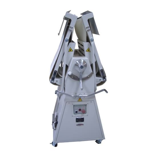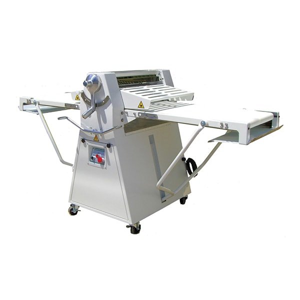 Dough Sheeter, floor model, reversible, 25″x95″ conveyor size, push button control, safety guard on both sides of rollers, aluminum alloy head housing, use for sheeting and stretching dough, 1 HP, 208v/60/1-ph, 3.88 amps, NEMA L6-15P, QPS