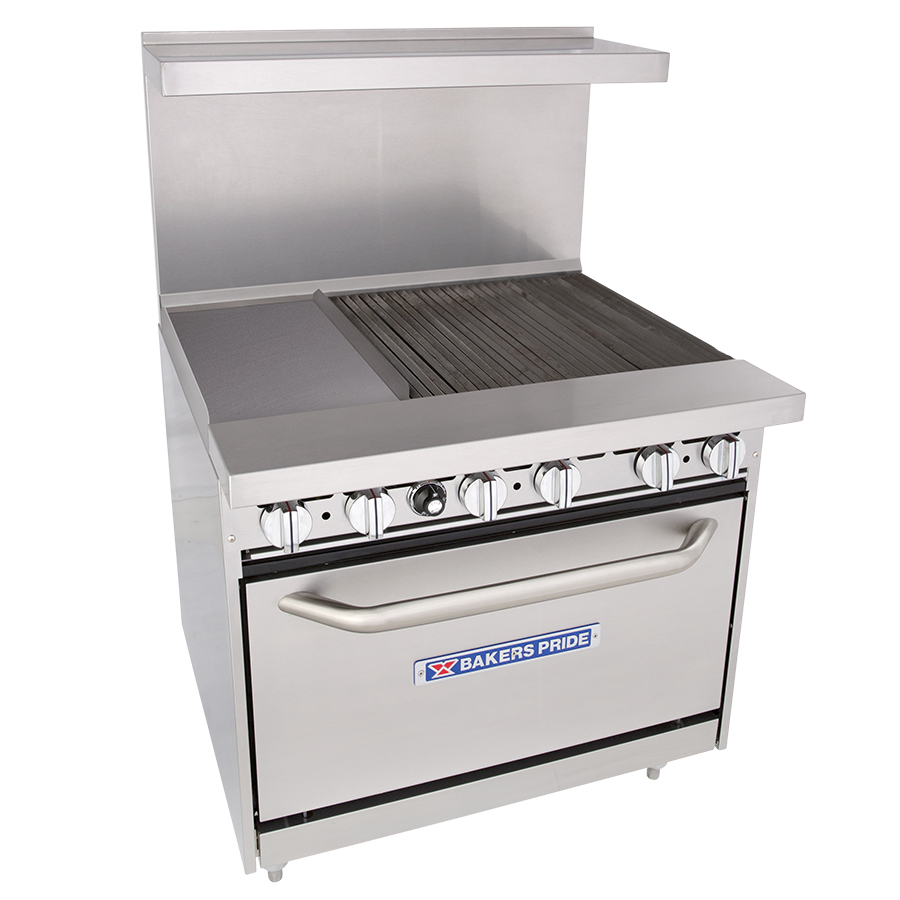 The Bakers Pride® model 36-BP-0B-BROLR24-G12-S30 range features one 24″ wide charbroiler, one 12″ griddle, and a 40,000 BTUH oven for high performance. A unique burner baffle distributes heat evenly throughout the oven, which is also fully porcelainized on five contact surfaces. Available for use with natural gas or liquid propane.