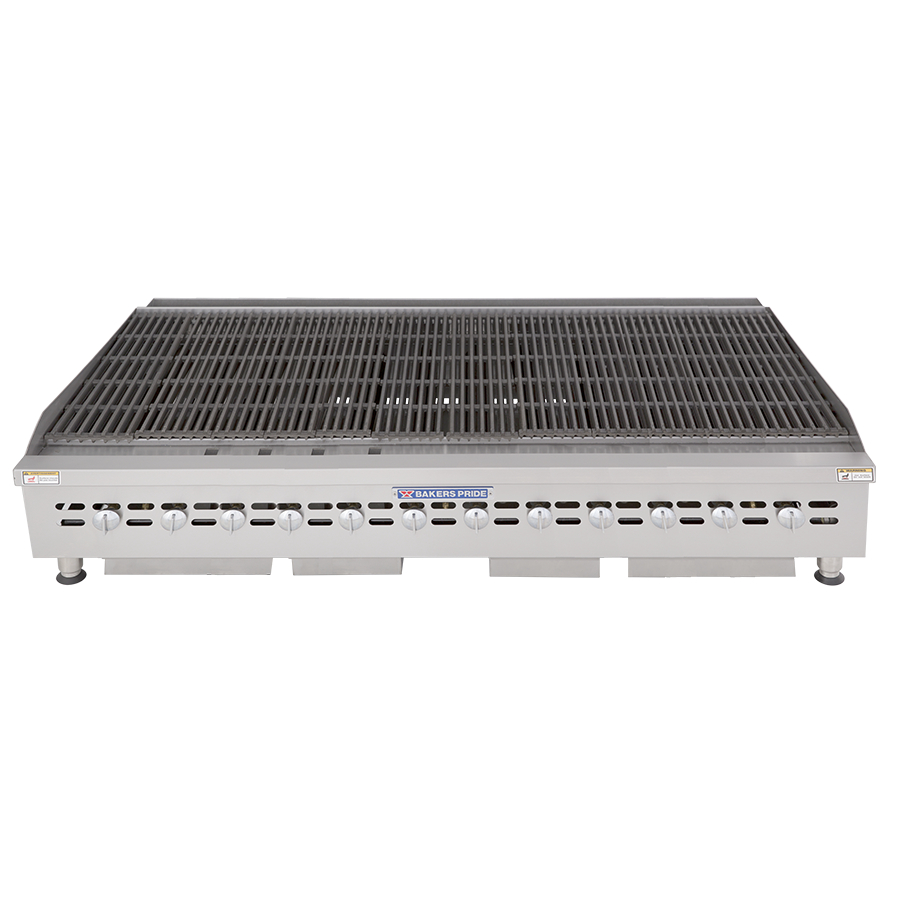 The Bakers Pride® model BPHCB-2472I charbroiler is designed for heavy-duty broiling in a low-profile, countertop design. Each of the twelve burners has a high output of 20,000 BTUH for maximum performance, while the cast-iron radiants ensure consistent temperatures over long hours of use. Standard grates are cast iron, or choose floating rod or meat grates at no extra charge. Grates may be adjusted in three separate titling positions for increased flexibility and temperature control.