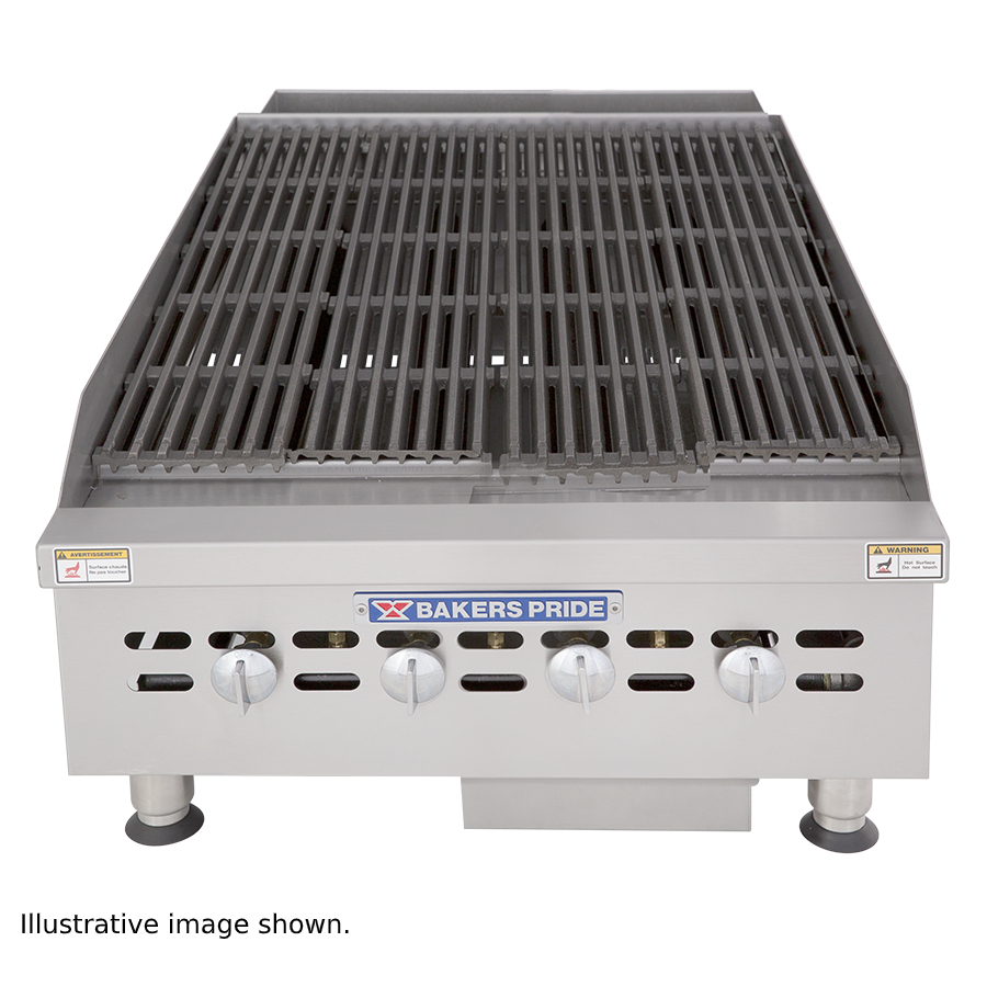 Create high demand food like burgers, steaks, and more to keep up with your busiest hours with the Bakers Pride BPHCRB-2424I 24″ Glo-Stone countertop charbroiler! This charbroiler features four high-power burners with a total of 80,000 BTU of heating power to make quick work of your most popular meats, fish, and vegetables. The individual controls make it easy to adjust temperature on the go while conserving gas, and the cast iron grates ensure fast heat-up and recovery time.