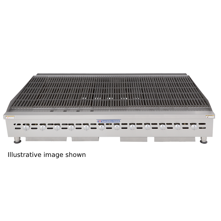 The Bakers Pride® model BPHCRB-2472I charbroiler is designed for heavy-duty broiling in a low-profile, countertop design. Each of the twelve burners has a high output of 20,000 BTUH for maximum performance. This model comes standard with Glo-Stones to maintain radiant heat while adding flavor and ambiance. Grates may be adjusted in three separate titling positions for increased flexibility and temperature control.