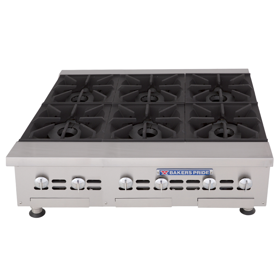 Easily saute, sear, or fry your most popular dishes at your business with the Bakers Pride BPHHP-636i 36″ two burner heavy duty hot plate! This hot plate features six individually-controlled burners with a total of 180,000 BTU to make quick work of almost any meal in your business. Each burner can reach a maximum of 180 degrees Fahrenheit, and the built-in heat-resistant combustion chamber helps ensure safety and a reliable burn.