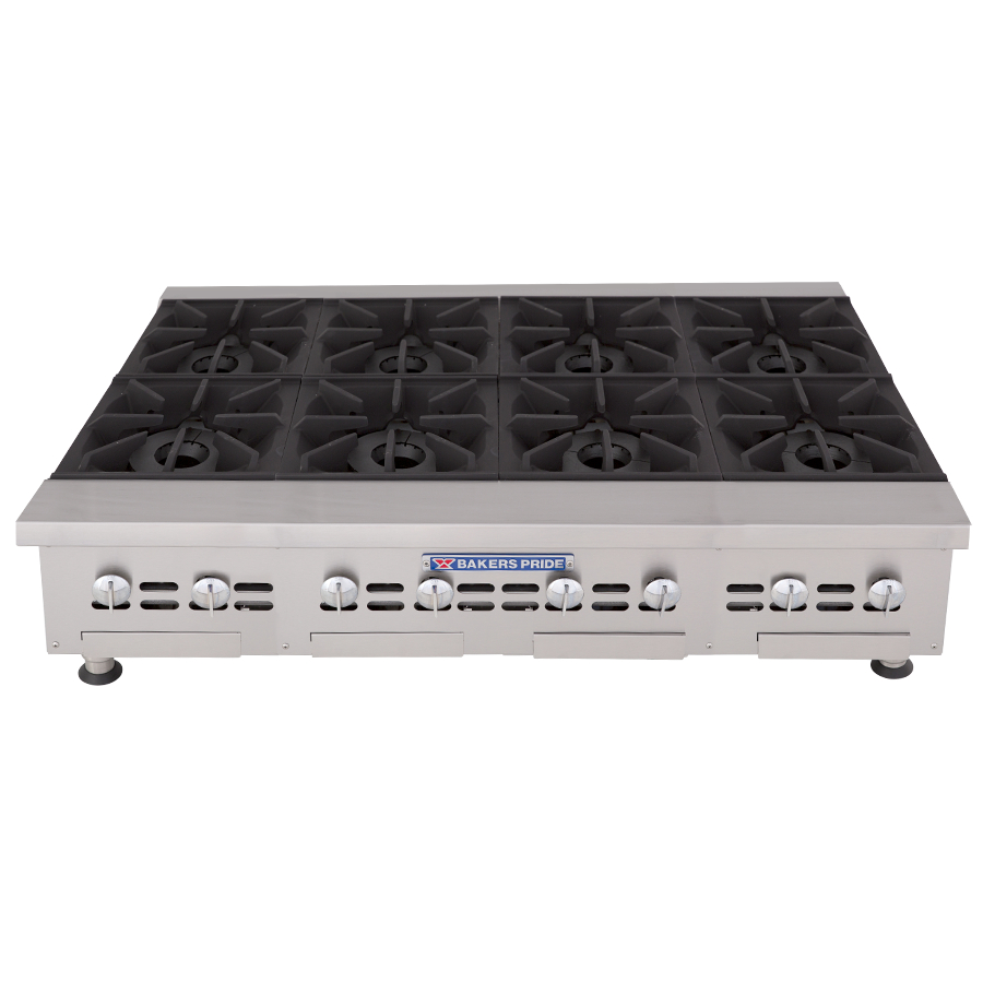 The Bakers Pride® model BPHHP-848i hot plate is built tough to meet the demands of busy kitchens. Each of the eight cast-iron burners has an output of 30,000 BTUH for maximum performance. The patented burner valves have low-flame setting for simmering and energy savings. This 48″ wide model also features heavy-duty, cast-iron top grates that are removable for easy cleaning.