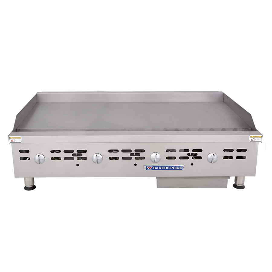 Quickly and easily cook a variety of your most popular dishes with the Bakers Pride BPHMG-2448i 48″ heavy duty manual control countertop grill! This grill features four individually-controlled burners with a total of 128,000 BTU to make quick work of almost any meal in your business. The burners sit underneath a 1″ thick griddle plate that heats quickly and evenly so that you can produce the best possible product for your hungry customers.