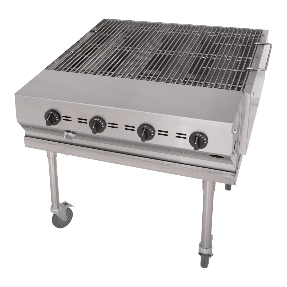 The exterior of this charbroiler is made from stainless steel for maximum durability, and the interior is made from aluminized steel to resist high-heat conditions. Other key components, like the water / grease pans, valve panel, and radiants are also made from stainless steel. An 8″ deep stainless steel work deck on the front of the unit also gives you a place to keep cooking utensils, and to plate or prep foods. And if you need mobility, it comes with (4) casters (2 locking).