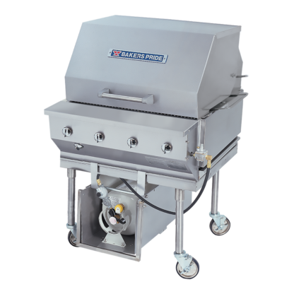 Take your culinary expertise outdoors and take advantage of one of the best venues for enjoying a great meal with this Bakers Pride CBBQ-30S -CP Ultimate natural gas outdoor 30″ charbroiler! Boasting 80,000 BTU of cooking power, this outdoor charbroiler lets you turn up the heat for searing and broiling, but if you need a lower temperature for delicate items or to hold finished food, its (4) independently-controlled burners let you do that. It has a 29″ wide by 24″ deep cooking area with a removable, heavy-duty nickel-chrome plated top grate for easy cleaning, and it boasts a mobile tank caddy to make it easy to transport and mount 40 lb. propane tanks. You also get to choose between a 30″ roll top hood or 30″ wind / splash guard!