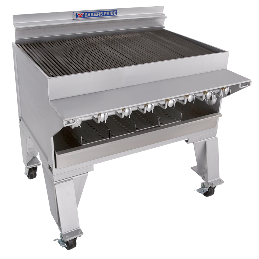 The Bakers Pride® model CH-8 charbroiler is the perfect choice for high-volume broiling. It is constructed of extra heavy-duty plate steel for durability, and each of the eight burners has an output of 18,000 BTUH for energy efficiency yet high production. This model features cast-iron top grates, but you can also select other grate types such as floating rods and meat grates at no extra charge. Grates may be adjusted in three separate titling positions for increased flexibility and temperature control. Heavy-duty, stainless steel radiants come standard or can be substituted for cast iron. For even more versatility, choose from a wide variety of options, such as Glo-Stones and log holders for added flavor or casters for mobility. This charbroiler can also be built in with stone, brick, or masonry for exhibition kitchens.