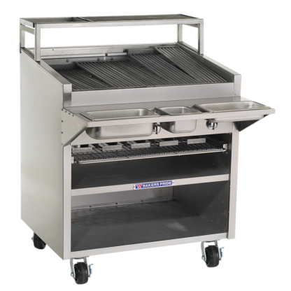 The Bakers Pride® model F-36R charbroiler is a cabinet-style, floor model charbroiler designed for energy efficiency and broiling performance. The four H burners produce a total output of 144,000 BTUH while allowing for consistent cooking.