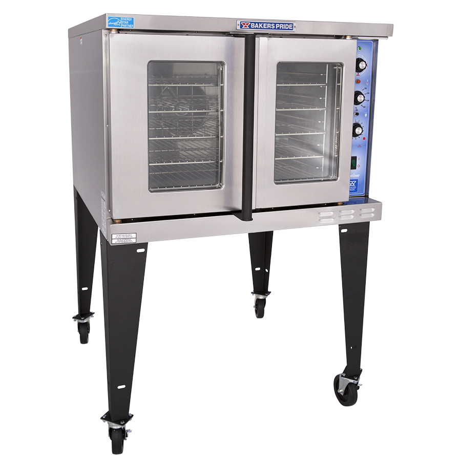 The Bakers Pride GDCO-E1 full-size convection oven has five chrome-plated racks on an 11-position guide with 1.62 inches between each. A light in the cavity illuminates product in the corrosion-resistant porcelain enamel interior. With its electronic temperature controls, the unit operates from 150 to 550 degrees Fahrenheit and distributes heat evenly through a two-speed fan. A cooldown mode runs the fan when the doors are open, quickly lowering the interior temperature.