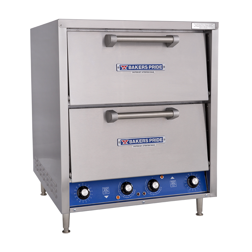 The Bakers Pride® model P46S oven features two independently controlled baking chambers: an upper chamber with two decks that is great for pizza, pretzels, and flatbreads and a taller lower chamber with one deck for baking or roasting. This oven has Cordierite decks with 3.25″ deck heights on the top and a 7.5″ deck height on the bottom. The two baking chambers are independently controlled, featuring a 284–680°F thermostat and 15-minute timer in the top chamber and a 140–550°F thermostat and 60-minute timer in the bottom chamber. This model comes standard with a stainless steel exterior and 4” adjustable legs. International voltages available.