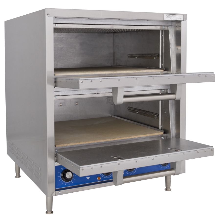 With a stainless steel exterior, this countertop oven will be sure to prove durable enough to last for years of service. The cabinet of the oven is fully insulated, so heat stays within the corrosion-resistant aluminized steel interior where it belongs. The two hearth decks have a temperature range from 150°F to 500°F, and sixty minute timers that have a continuous ring. Both of the decks allow you to warm, par-bake, or bake products until they are ready to be served to customers, and you can easily place items in and retrieve them from the decks. The oven stands stable with the help of the plastic legs. For a compact and affordable way to heat up food items for customers, the P48S is a great option.