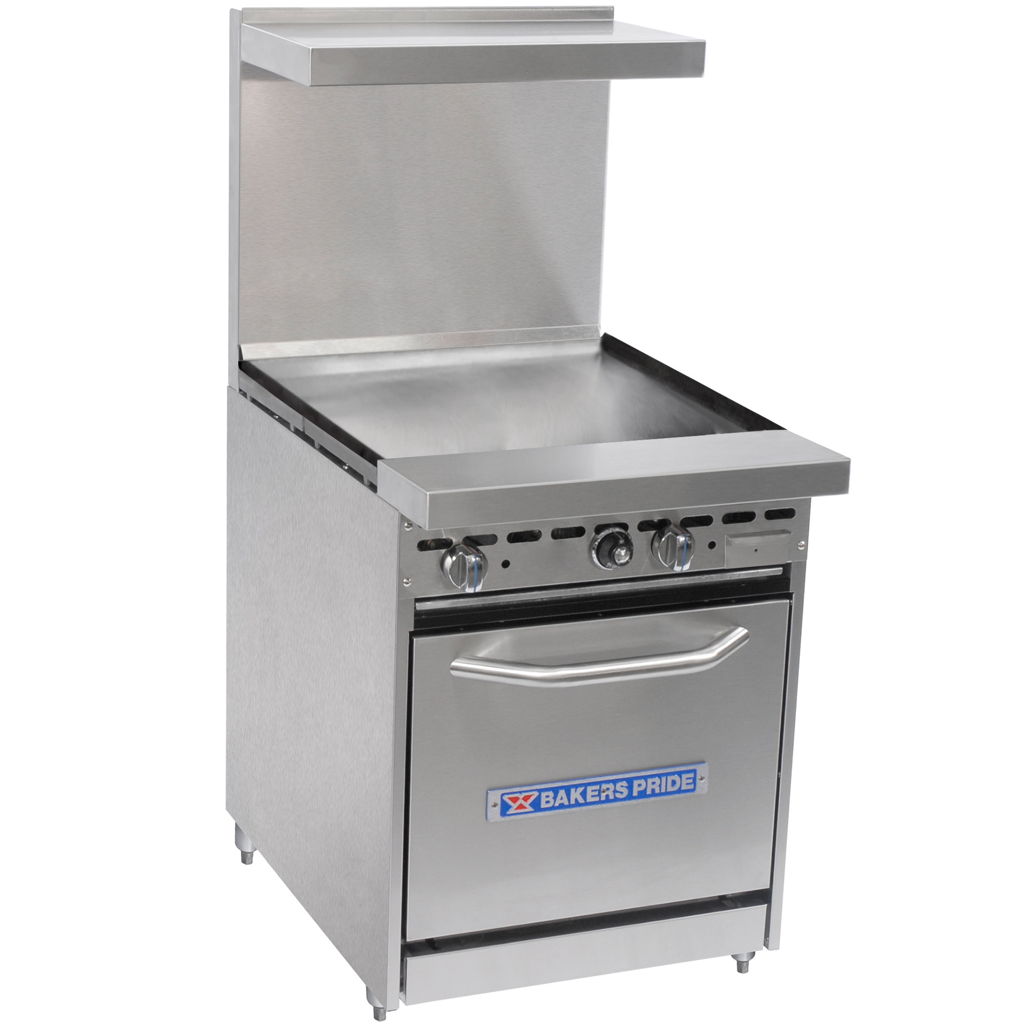 For optimum convenience and usability, choose this Bakers Pride Restaurant Series 24-BP-0B-G24-S20 Natural Gas/Liquid Propane range for all of your restaurant cooking needs. With a 1″ thick griddle featuring a 24″ x 24″ manually controlled cooking area and a 7″ landing ledge, this gas range gives you ample space to cook hamburgers, chicken, fish, or even bacon and eggs! At the same time, its standard 30,000 BTU 20″ oven gives you plenty of cooking power for consistent results, and a heavy duty, chrome-plated rack offers ample cooking space.