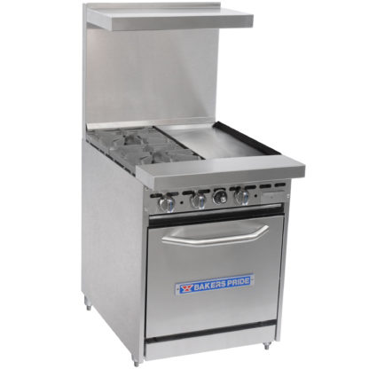 For optimum convenience and usability, choose this Bakers Pride Restaurant Series 24-BP-2B-G12-S20 natural gas/ liquid propane range for all of your restaurant cooking needs. With a 1″ thick griddle featuring a 12″ x 24″ manually controlled cooking area, two 40,000 BTU burners set in 12″ x 12″ heavy duty cast iron grates, and a 7″ landing ledge, this gas range gives you ample space to evenly cook hamburgers, chicken, fish, or even bacon and eggs! At the same time, its standard 30,000 BTU 20″ oven gives you plenty of cooking power for consistent results, and a heavy duty, chrome-plated rack offers ample cooking space.