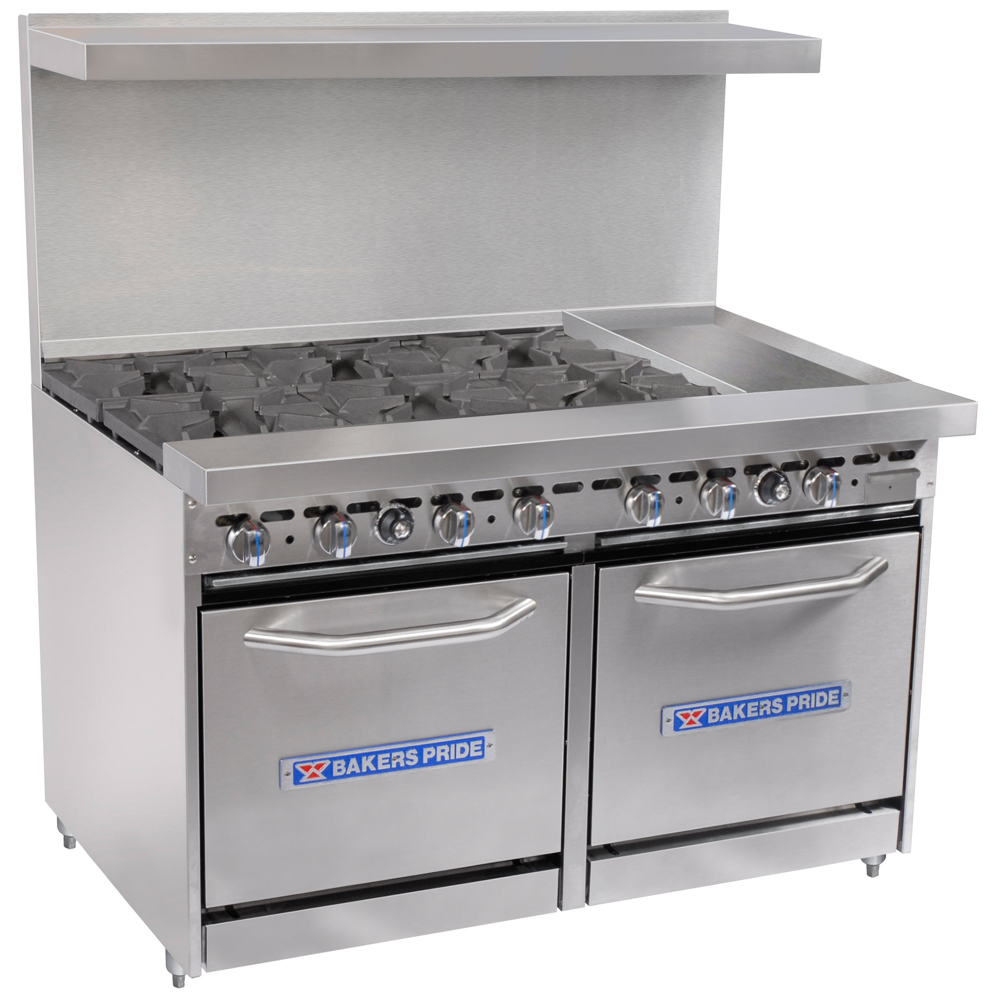 For optimum convenience and usability, choose this Bakers Pride Restaurant Series 48-BP-6B-G12-S20 range for all of your restaurant cooking needs. With a 1″ thick griddle featuring a 12″ x 24″ manually controlled cooking area, six 40,000 BTU burners, set in 12″ x 12″ heavy duty cast iron grates, and a 7″ landing ledge, this gas range gives you ample space to evenly cook hamburgers, chicken, fish, or even bacon and eggs! At the same time, its two 30,000 BTU 20″ ovens give you plenty of cooking power for consistent results, and a heavy duty, chrome-plated rack in each oven gives plenty of space to cook your most popular dishes.