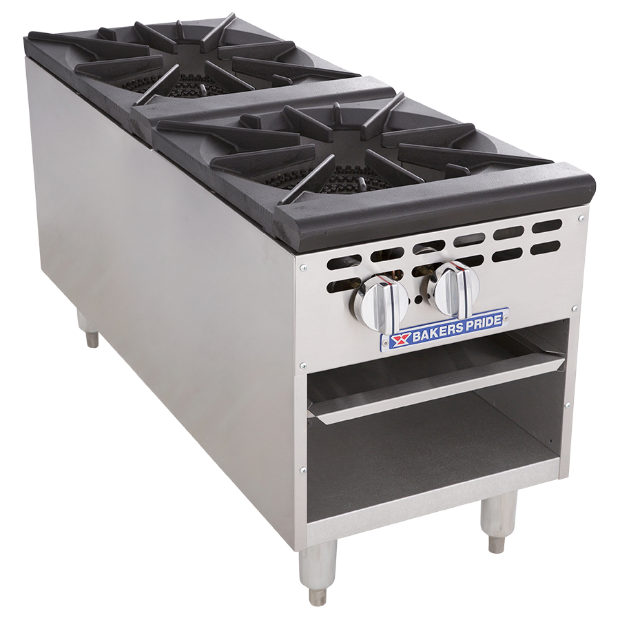 For optimum convenience and usability, choose this Bakers Pride Restaurant Series BPSP-18-2-D natural gas two burner stock pot range to quickly prepare a variety of pasta, soups, sauces, and stocks! With (2) three-ring burners arranged front to back, this stock pot range delivers up to 180,000 BTU of cooking power.