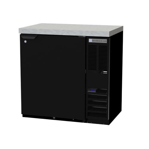 Refrigerated Food Rated Back Bar Storage Cabinet, one-section, 36″W, 36″ H, 8.31 cu. ft., (1) solid door, snap-in door gasket, (2) epoxy coated steel shelves, (1) 1/2 barrel kegs, LED interior lighting with manual on/off switch, black exterior finish, 2″ stainless top, stainless steel interior with radius corners is easy to keep clean & meets NSF Standard 7 for open food container, side mounted self-contained refrigeration with storage above, R290 Hydrocarbon refrigerant, 1/4 HP, cULus, UL EPH Classified, UL-Sanitation, Made in USA