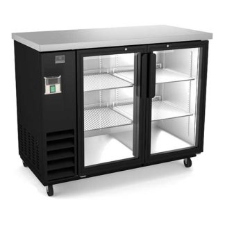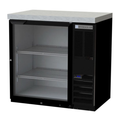 Refrigerated Food Rated Back Bar Storage Cabinet, one-section, 36″W, 36″ H, 8.36 cu. ft., (1) glass door, snap-in door gasket, (2) epoxy coated steel shelves, (1) 1/2 barrel kegs, LED interior lighting with manual on/off switch, black exterior, 2″ stainless top, stainless steel interior with radius corners is easy to keep clean & meets NSF Standard 7 for open food container, side mounted self-contained refrigeration with storage above, R290 Hydrocarbon refrigerant, 1/4 HP, cULus, UL EPH Classified, UL-Sanitation, Made in USA