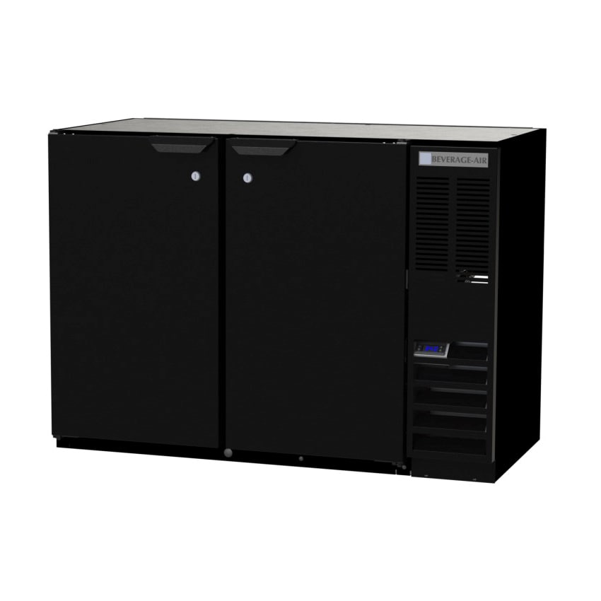 Refrigerated Food Rated Back Bar Storage Cabinet, two-section, 48″W, 34″ H, 12.4 cu. ft., (2) solid doors, snap-in door gasket, (4) epoxy coated steel shelves, (2) 1/2 barrel kegs, LED interior lighting with manual on/off switch, black exterior finish, stainless steel interior with radius corners is easy to keep clean & meets NSF Standard 7 for open food container, right-mounted self-contained refrigeration, R290 Hydrocarbon refrigerant, 1/4 HP, cULus, UL EPH Classified, UL-Sanitation, Made in USA