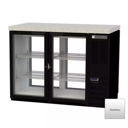 Refrigerated Pass-Thru Back Bar Open Food Rated Refrigerator, two section, 48″ W, 36″ H, 13.6 cu. ft., (4) solid doors, (4) epoxy coated steel shelves, (2) 1/2 barrel keg, LED interior lighting, 2″ stainless steel top, stainless steel interior with radius corners is easy to keep clean and meets NSF Standard 7 for open food container, right-mounted self-contained refrigeration, R290 Hydrocarbon refrigerant, 1/3 HP, UL, cUL, UL EPH, MADE IN USA, 115v/60/1ph