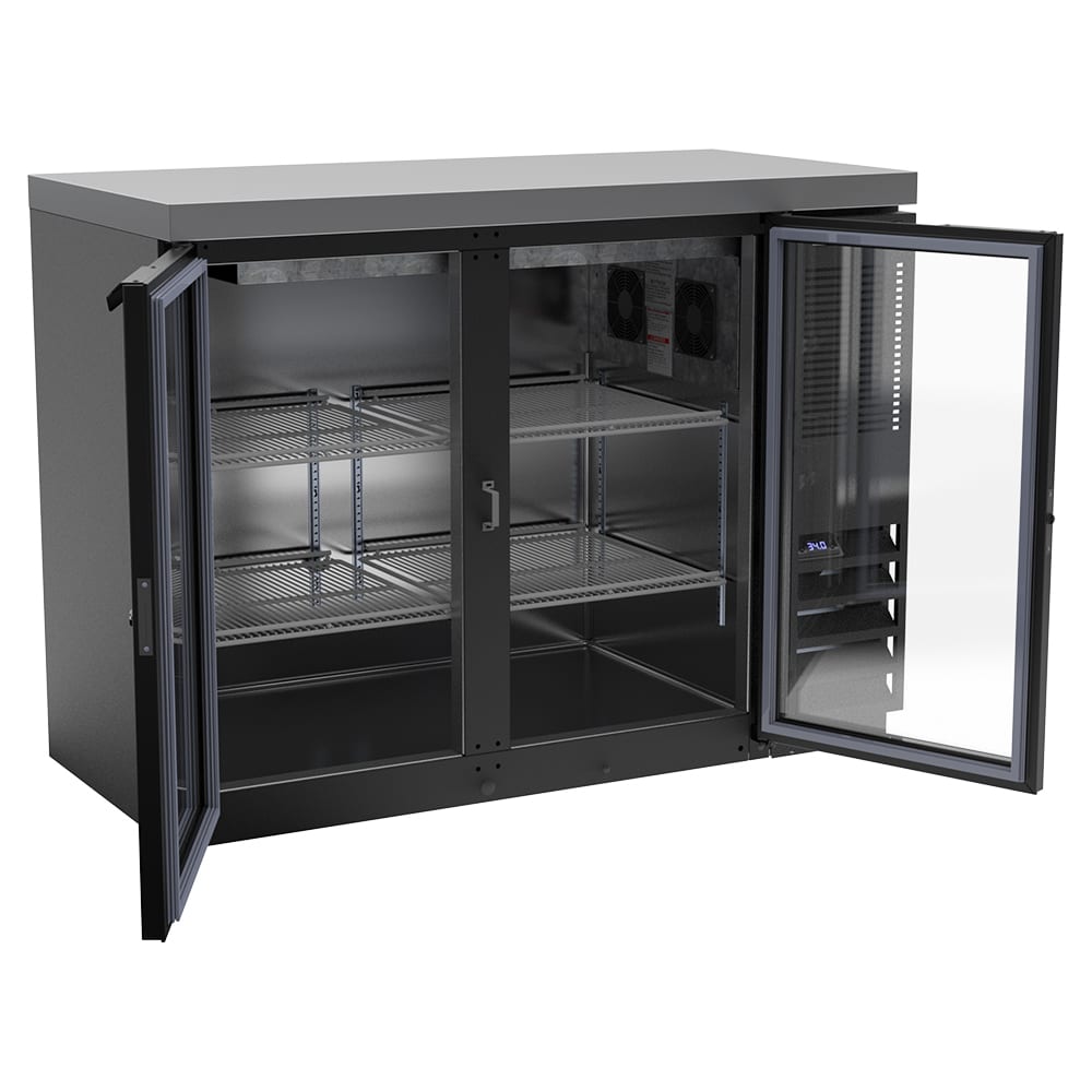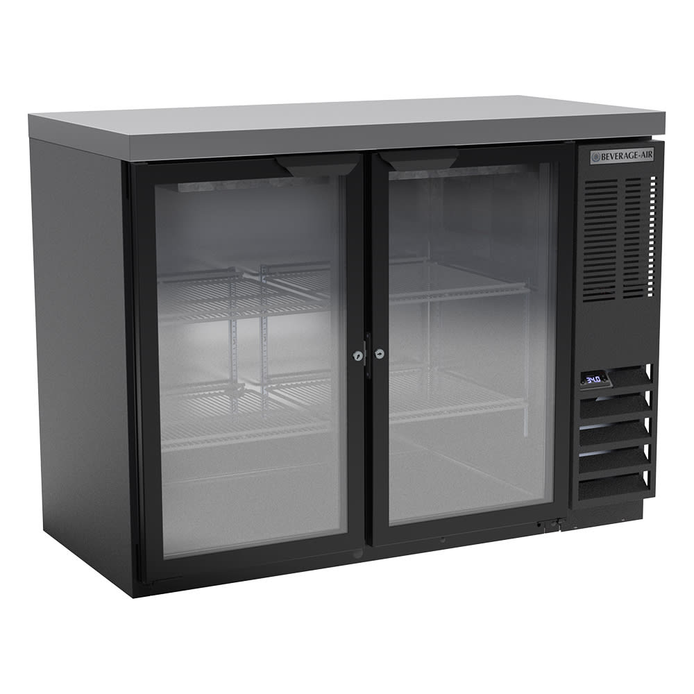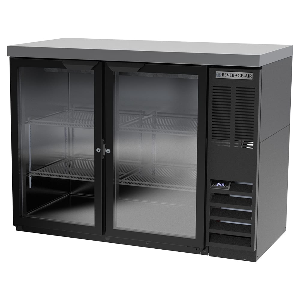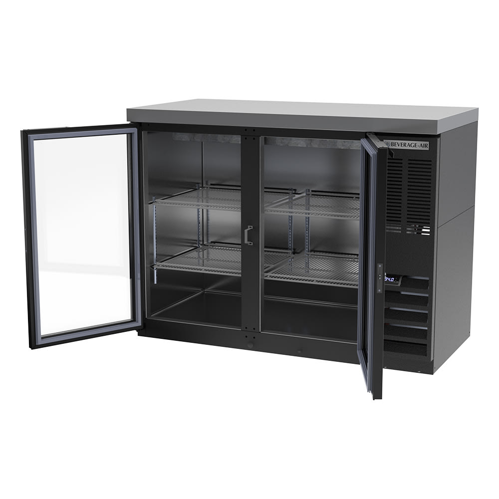 The Beverage Air BB48HC-1-G-B-27 two-section back bar cooler holds product on four epoxy-coated shelves. When these are removed, the unit can accommodate two kegs. LED lighting enhances visibility, so operators can see product through the glass doors. Since these doors self-close, cold air stays in the cabinet. Locks on the doors help prevent theft, and magnetic door gaskets create an airtight seal. The forced-air refrigeration system in the Beverage Air BB48HC-1-G-B-27 two-section bar refrigerator rapidly cools product. R290 hydrocarbon refrigerant is used to maintain a temperature of 38 degrees Fahrenheit.