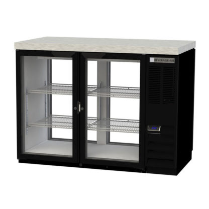 Refrigerated Pass-Thru Back Bar Refrigerator, two section, 48″ W, 36″ H, 13.6 cu. ft., (4) glass doors, (4) epoxy coated steel shelves, (2) 1/2 barrel keg, LED interior lighting, 2″ stainless steel top, black exterior finish, galvanized interior, right-mounted self-contained refrigeration, R290 Hydrocarbon refrigerant, 1/3 HP, UL, cULus, UL EPH CLASSIFIED, UL-Sanitation, MADE IN USA, 115v/60/1ph