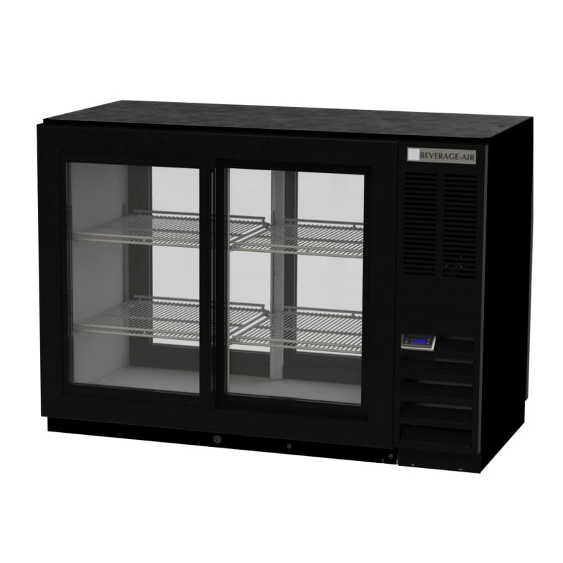 Refrigerated Pass-Thru Food Back Bar Storage Cabinet, two section, 48″ W, 34″ H, 13.6 cu. ft., (4) locking sliding glass doors, (4) epoxy coated steel shelves, (2) 1/2 barrel keg, LED interior lighting with manual on/off switch, black exterior finish, galvanized sub top, stainless steel interior with radius corners is easy to keep clean and meets NSF Standard 7 for open food container, right-mounted self-contained refrigeration, R290 Hydrocarbon refrigerant, 1/3 HP, UL, cUL, UL EPH, MADE IN USA, 115v/60/1ph
