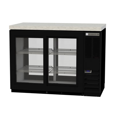 Refrigerated Pass-Thru Back Bar Refrigerator, two section, 48″ W, 36″ H, 13.6 cu. ft., (4) locking sliding glass doors, (4) epoxy coated steel shelves, (2) 1/2 barrel keg, LED interior lighting, 2″ stainless steel top, black exterior finish, galvanized interior, right-mounted self-contained refrigeration, R290 Hydrocarbon refrigerant, 1/3 HP, UL, cULus, UL EPH CLASSIFIED, UL-Sanitation, MADE IN USA, 115v/60/1ph
