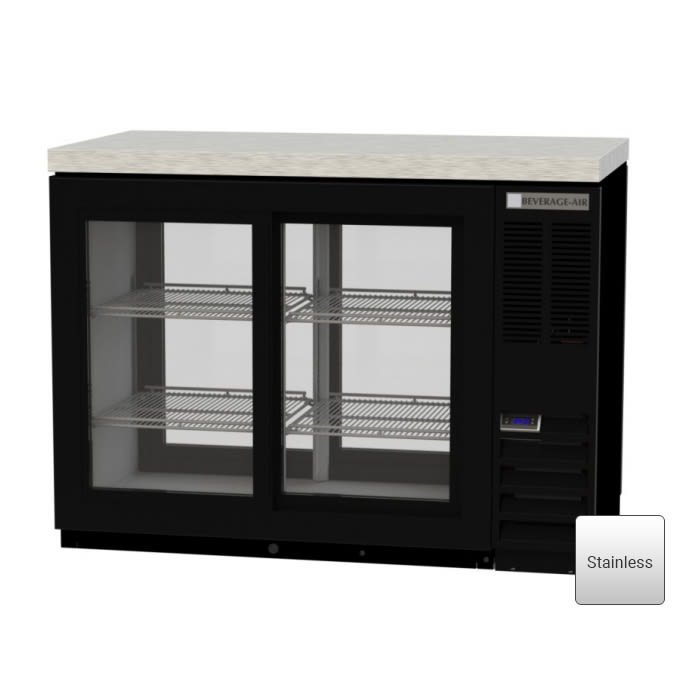 The BB48HC-1-GS-PT-S-27 bar cooler features a black exterior finish with a stainless steel top that can be quickly wiped clean. Its sliding glass doors are self-closing and designed with magnetic gaskets that create a positive seal to retain cold air. To streamline restocking, the doors have a stay-open feature.