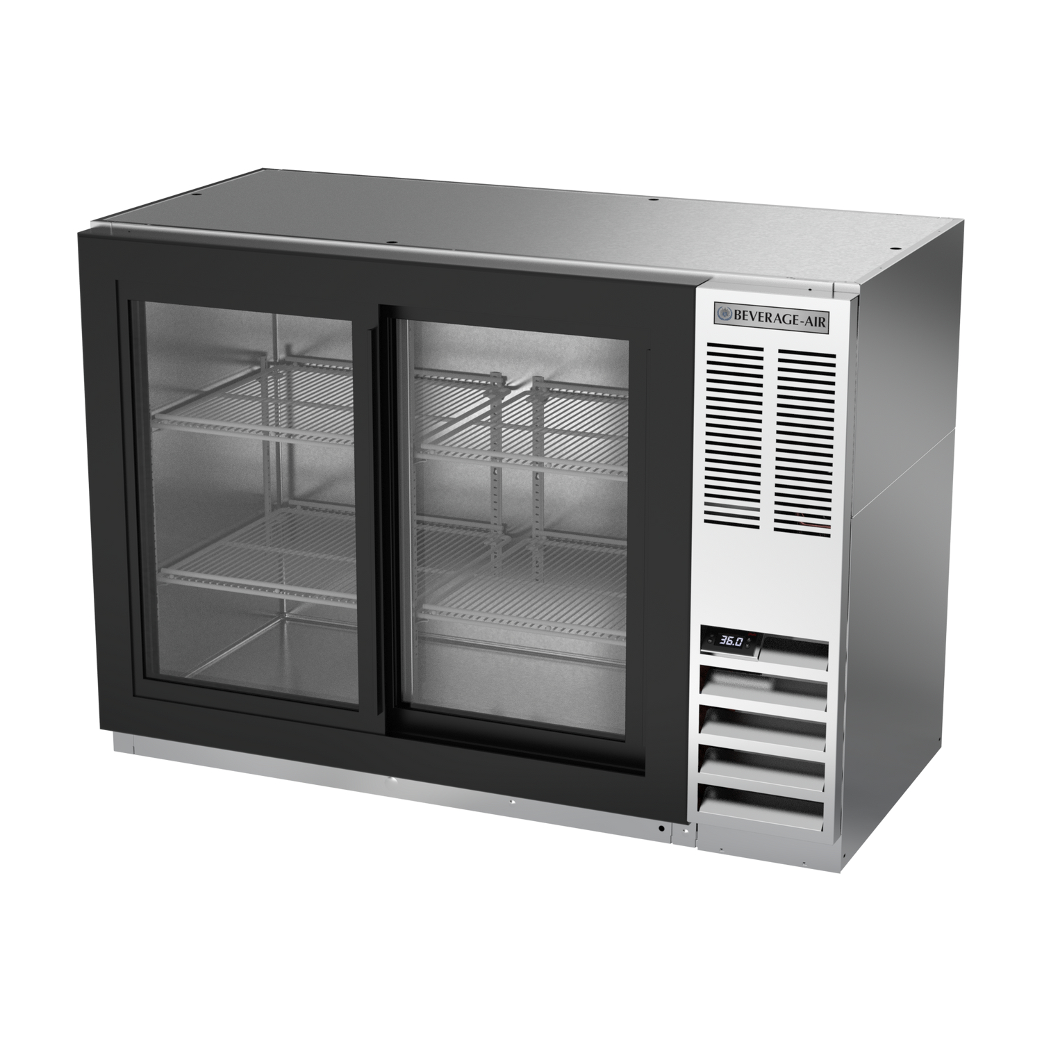 Refrigerated Back Bar Storage Cabinet, two section, 48″ W, 34″ H, 12.1 cu. ft., (2) sliding glass doors, snap-in door gasket, (4) epoxy coated steel shelves, (2) 1/2 barrel kegs, LED interior lighting with manual on/off switch, stainless steel exterior finish, galvanized interior and top, right-mounted self-contained refrigeration, R290 Hydrocarbon refrigerant, 1/3 hp, UL, cUL, UL EPH, MADE IN USA