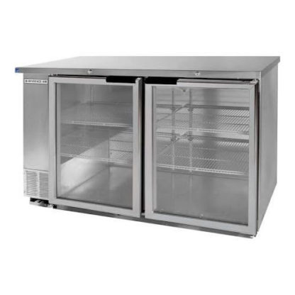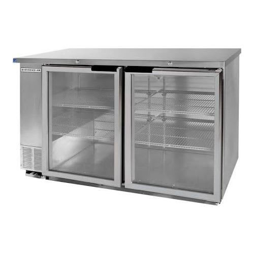Refrigerated Back Bar Storage Cabinet, two section, 59″ W, 37-1/4″ H, 23.8 cu. ft., (2) glass doors, snap-in door gasket, (4) epoxy coated steel shelves, (3) 1/2 barrel kegs, LED interior lighting with manual on/off switch, stainless steel top, with stainless steel floors & galvanized interior, left-mounted self-contained refrigeration, R290 Hydrocarbon refrigerant, 1/3 hp, UL, cUL, UL EPH, NSF, MADE IN USA