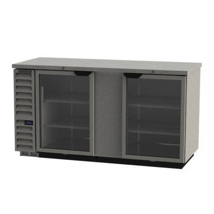 Refrigerated Back Bar Storage Cabinet, two-section, 69″W, 37-1/4″ H, 25.93 cu. ft., (2) glass doors, snap-in door gasket, (4) epoxy coated steel shelves, (3) 1/2 barrel kegs, LED interior lighting with manual on/off switch, stainless steel top & exterior, galvanized interior, left-mounted self-contained refrigeration, R290 Hydrocarbon refrigerant, 1/3 HP, cULus, UL EPH Classified, UL-Sanitation, Made in USA