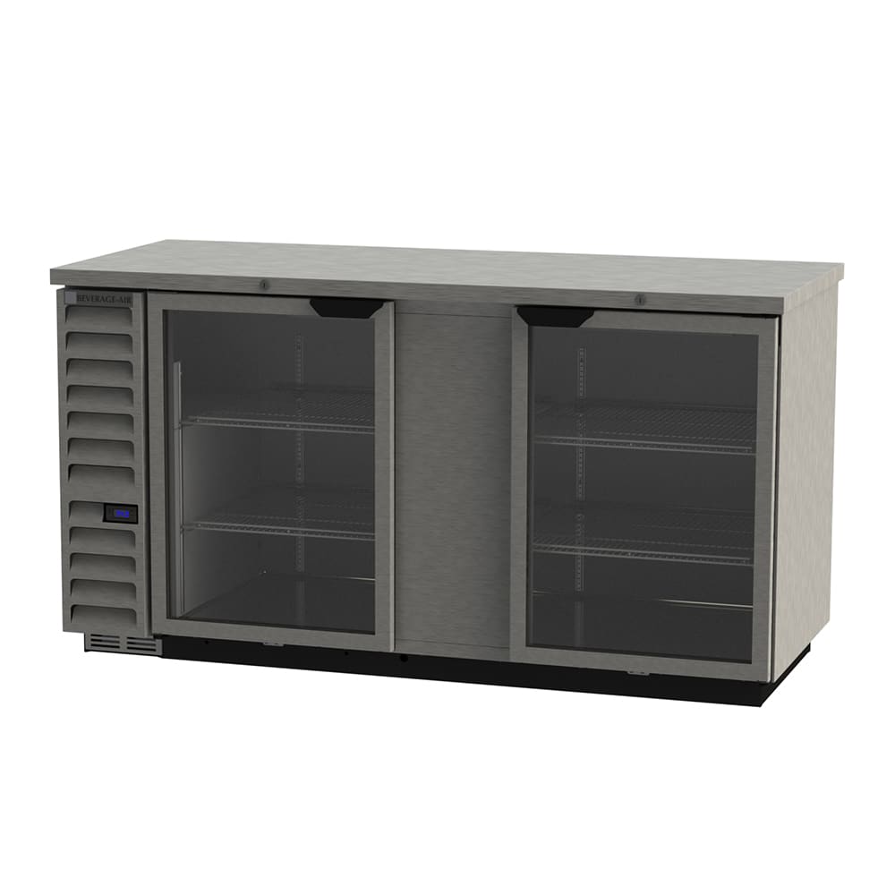 The Beverage Air BB68HC-1-G-S bar back refrigerator can accommodate three half-barrel kegs and has four adjustable shelves that can be positioned to support ingredients for making drinks and garnishes. Each shelf is coated with epoxy to resist corrosion and seal out moisture and gritty buildup. To access the interior of the refrigerator, users can open the two swinging glass doors, which have the ability to stay open during cleaning or restocking procedures or to self-close during fast service. LED lighting inside the unit can be controlled with a manual on/off switch, enabling the user to reduce excess energy consumption during slow periods.