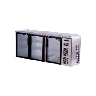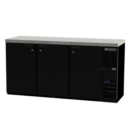 Refrigerated Back Bar Storage Cabinet, three-section, 72″W, 36″ H, 19.92 cu. ft. capacity, (3) solid doors with locks, snap-in door gasket, (6) epoxy coated steel shelves, (3) 1/2 barrel kegs, LED interior lighting with manual on/off switch, 2″ stainless steel top, black exterior finish, galvanized interior with stainless steel floor, right-mounted self-contained refrigeration, R290 Hydrocarbon refrigerant, 1/3 HP, UL, cULus, UL EPH CLASSIFIED, UL-Sanitation, MADE IN USA, 115v/60/1ph
