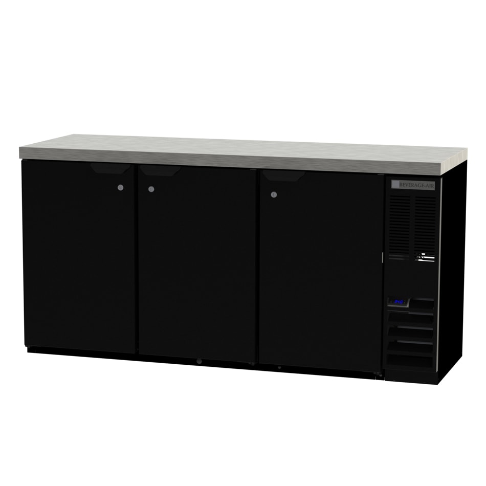 The Beverage Air BB72HC-1-B-27 three-section bar refrigerator maintains cold temperatures with R290 hydrocarbon refrigerant. The stored product is cooled evenly and rapidly by a forced air refrigeration system. Since the unit has an electronic control system, the operator can easily monitor and adjust interior conditions.