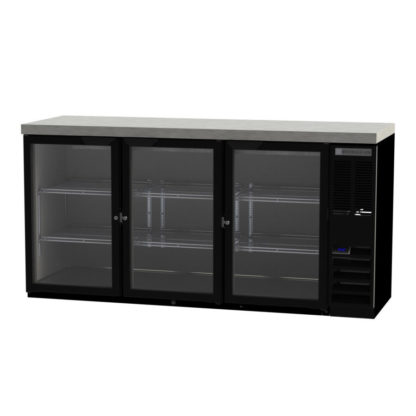 The Beverage Air BB72HC-1-FG-S-27 three-section bar refrigerator has 19.92 cubic feet of storage space. Six shelves are coated in epoxy to resist corrosion and organize product. When the shelves are removed, three half-barrel kegs fit in the cabinet. Temperatures in the cabinet are kept cold with R290 hydrocarbon refrigerant. Its self-contained refrigeration system has all the components built together, making it easy to maintain and service the system.
