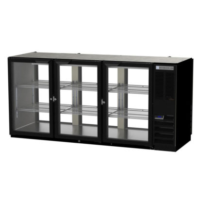 Refrigerated Back Bar Pass-Thru Storage Cabinet, three section, 72″ W, 34″ H, 22.1 cu. ft., (6) glass doors, (6) epoxy coated steel shelves, (3) 1/2 barrel kegs, LED interior lighting with manual on/off switch, galvanized top & interior, black exterior finish, right-mounted self-contained refrigeration, R290 Hydrocarbon refrigerant, 1/3 HP, UL, cULus, UL EPH CLASSIFIED, UL-Sanitation, NSF, MADE IN USA, 115v/60/1ph