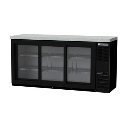 Refrigerated Back Bar Storage Cabinet, three-section, 72″W, 36″H, 19.92 cu. ft. capacity, (3) locking sliding glass doors, snap-in door gasket, (6) epoxy coated steel shelves, (3) 1/2 barrel kegs, LED interior lighting with manual on/off switch, 2″ stainless steel top, black exterior finish, galvanized interior with stainless steel floor, right-mounted self-contained refrigeration, R290 Hydrocarbon refrigerant, 1/3 HP, UL, cULus, UL EPH Classified, UL-Sanitation, MADE IN USA, 115v/60/1ph