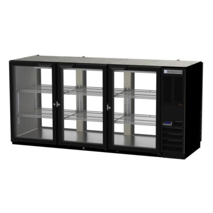 Refrigerated Open Food Rated Back Bar Pass-Thru Storage Cabinet, three section, 72″ W, 34″ H, (6) locking sliding glass doors, (6) epoxy coated steel shelves, (3) 1/2 barrel kegs, LED interior lighting with manual on/off switch, stainless steel exterior with black frame doors, galvanized top, stainless steel interior with radius corners is easy to keep clean and meets NSF Standard 7 for open food container, right-mounted self-contained refrigeration, R290 Hydrocarbon refrigerant, 1/4 HP, UL, cUL, UL EPH, NSF, MADE IN USA, 115v/60/1ph