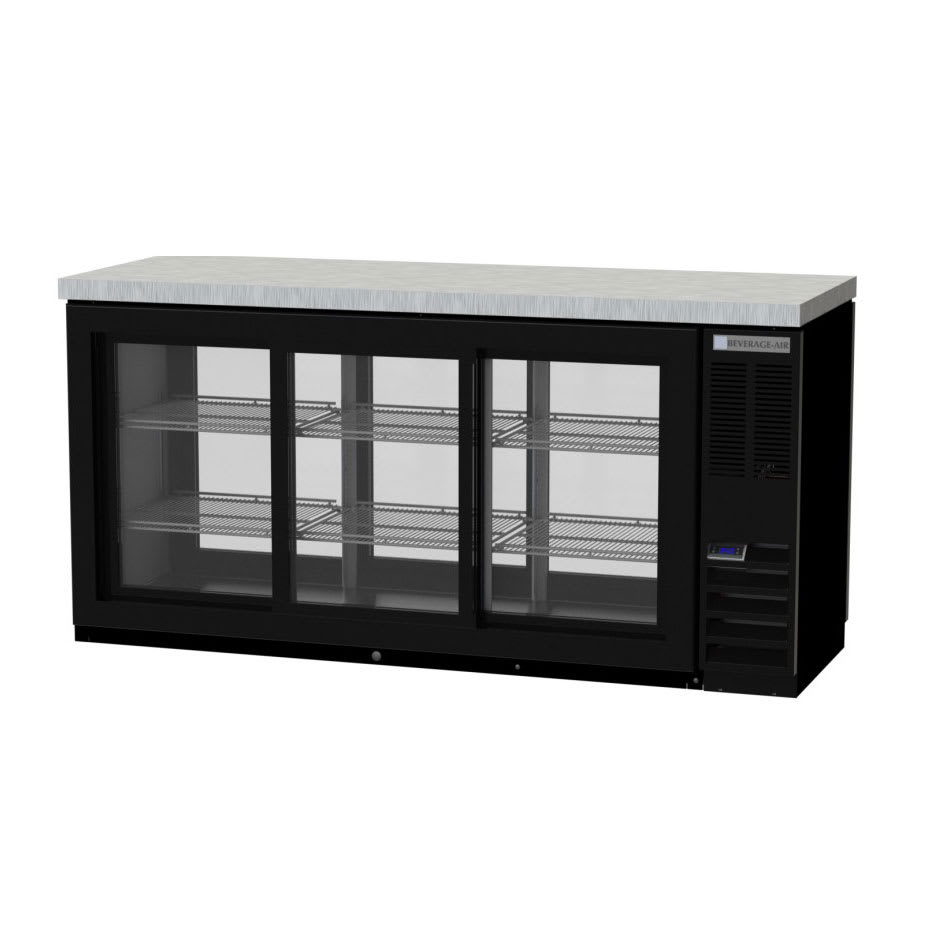 Refrigerated Back Bar Pass-Thru Storage Cabinet, three section, 72″ W, 36″ H, 22.1 cu. ft., (6) locking sliding glass doors, (6) epoxy coated steel shelves, (3) 1/2 barrel kegs, LED interior lighting with manual on/off switch, 2″ stainless steel top, black exterior finish, galvanized interior, right-mounted self-contained refrigeration, R290 Hydrocarbon refrigerant, 1/3 HP, UL, cULus, UL EPH CLASSIFIED, UL-Sanitation, NSF, MADE IN USA, 115v/60/1ph