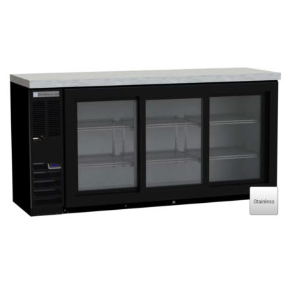 Refrigerated Food Rated Back Bar Storage Cabinet, three section, 79″ W, 37-1/4″ H, 33.59 cu. ft., (3) glass doors, snap-in door gasket, (6) epoxy coated steel shelves, (4) 1/2 barrel kegs, LED interior lighting with manual on/off switch, stainless steel top, stainless steel interior with radius corners is easy to keep clean and meets NSF Standard 7 for open container, left-mounted self-contained refrigeration, R290 Hydrocarbon refrigerant, 1/3 HP, UL, cUL, UL EPH, NSF, MADE IN USA, 115v/60/1ph