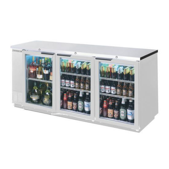 The Beverage Air BB94HC-1-G-S three-section bar refrigerator comes with six epoxy-coated, corrosion-resistant shelves. Interior LED lights shine on products to enhance visibility. A forced air system quickly cools products, and R290 hydrocarbon refrigerant ensures the temperatures stay cold.
