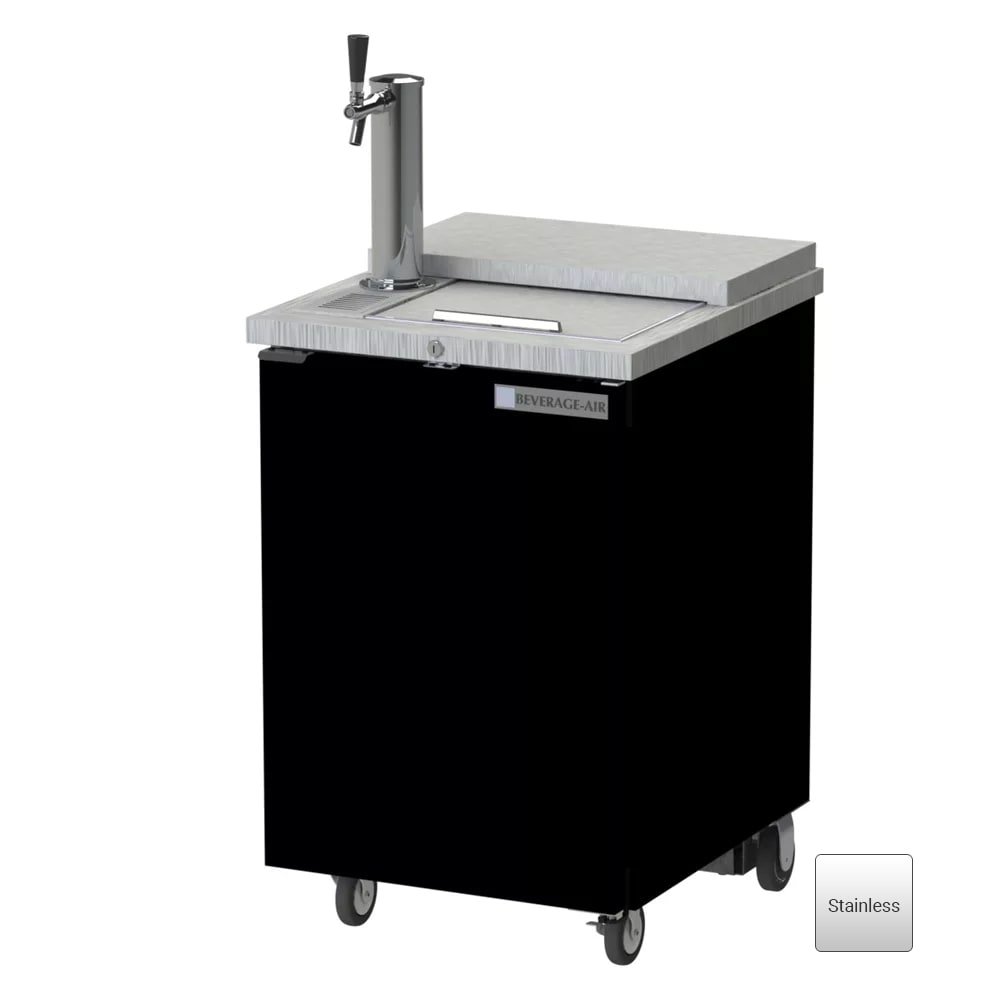 To keep beer cold, the Beverage Air BM23HC-C-S draft beer system has an insulated tower, which contains a single faucet for dispensing one type of beer. A beer waste bottle catches any product that may spill while dispensing to keep the countertop clean. The single door shuts tight with magnetic gaskets. At the end of the day, the door can be locked to prevent theft.